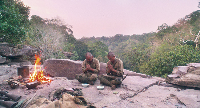 On se dit qu’il y a quelque chose de profondément japonais dans ce personnage et son histoire, qui va à l’inverse de la démarche Hara-kiri. Comment va-t-on au delà des clichés ? Essayer de débusquer ce qui pourrait relever du cliché m’obsède. Je cherche toujours à complexifier à partir d’une situation qui ramène une série de choses attendues, d’images toutes faites ou de conclusion rapides, comme « les japonais ont le sens du sacrifice », « ils sont capables d’aller très loin »… C’est tellement facile de conclure à tout cela au vu de cette histoire. Il fallait affronter ces clichés et ne pas s’en satisfaire. Ma méthode a été de me mettre à la place des protagonistes, non pas en tant que japonais puisque je ne le suis pas, mais essayer de me sentir raisonner avec eux. Pas seulement avec Onoda mais avec les autres aussi, c’est une histoire collective. J’écris depuis la France les dialogues en français dont j’ai dû oublier qu’ils étaient japonais. Je n’ai pas voulu être obsédé par l’immersion culturelle, ce n’est pas un travail d’historien. J’étais aidé par le fait que le film ne se passait pas au Japon. Les acteurs aussi étaient libérés d’un certain nombre de contraintes locales puisqu’ils étaient déplacés. Evidemment leurs comportements étaient toujours marqués par la culture japonaise. Le fait qu’ils étaient ailleurs résonnait avec mon déplacement à moi et ça m’a permis d’accéder à une dimension aventureuse, c’est à dire de partir à la recherche de quelque chose. Je sentais que je pouvais le faire aussi parce qu’on n’allait pas dans leur pays. Je ne me serai pas senti légitime de représenter vraiment le Japon. Les codes auraient été trop compliqués pour moi à déchiffrer. Là, l’histoire n’était pas que japonaise mais plus universelle.