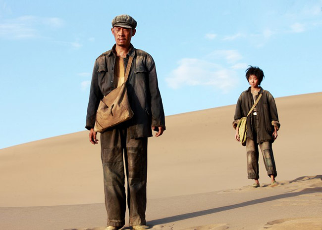 En Chine durant la Révolution culturelle. Un homme, Yi Zhang, casquette sur la tête, sac en bandoulière débarque du désert dans un village reculé où il est question d’une projection cinématographique. L’homme traverse des dunes à perte de vue, des paysages lunaires dans une tempête de sable impressionnante où il lutte contre la puissance de la nature dans des plans d’ensemble sublimes. La lumière en contre-jour est forcément très belle sur une image du directeur photo Zhao Xiaoding. L’homme rencontrera rapidement la jeune et hirsute Liu, Liu Haocun. Les deux protagonistes formeront un duo burlesque exceptionnel, la gestuelle des corps rappelant Buster Keaton, Chaplin, pour un retour au cinéma d’antan. Ces deux « gavroches » se disputeront une bobine de film jusqu’à se l’envoyer à la figure. Les personnages ne sont pas ce qu’ils semblent être au premier abord. La précision d’écriture les amènera à interpréter eux-même un autre rôle, d’où la vérité transparaitra parfois dans la douleur d’un propos ou dans une larme. Tous les enjeux du cinéma sont là et le scénario les complexifie.
